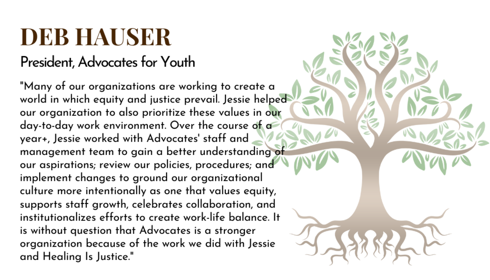 Our signature curriculum incorporates a combination of consulting and coaching structures to help individuals and teams heal themselves. They’ll become more empowered and strategic in seeking justice for themselves, their families, their communities, their teams, their schools, their organizations/companies.